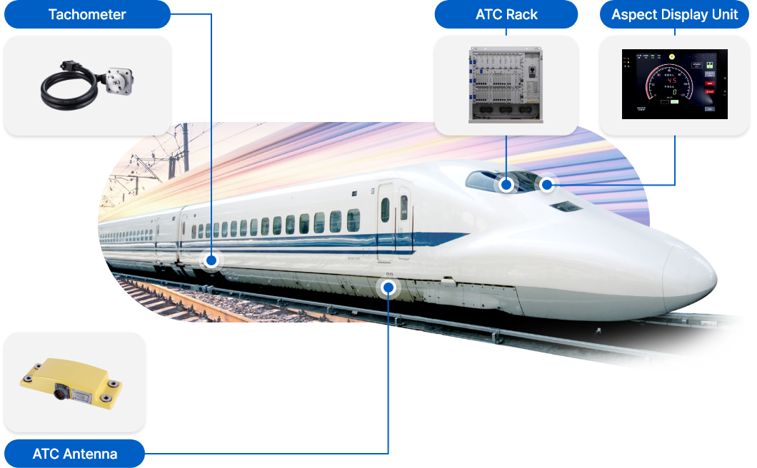 Automatic Train Control On-board Signaling is the device that displays continuously allowable speed of the vehicle and automatically stops or decelerates a train if it exceeds the permissible speed, by receiving the operating conditions on the wayside. On-board Signaling System consists of ATC Rack, Aspect Display Unit (ADU), ATC Antenna and Tachometer.