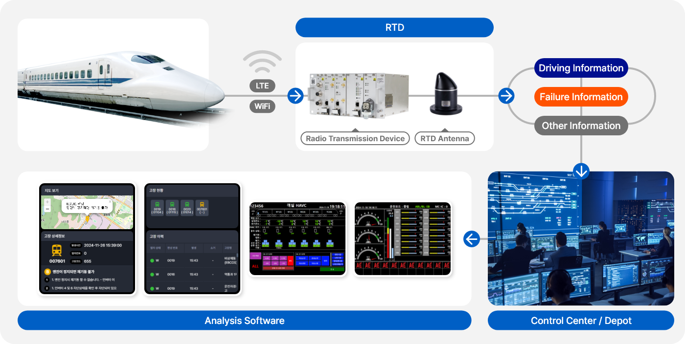 RTD is the optimal system to increase maintenance efficiency through wayside analysis software, transmitting running railway vehicle’s failure and driving information, others to the wayside manager in real time or at the time of entering the depot.