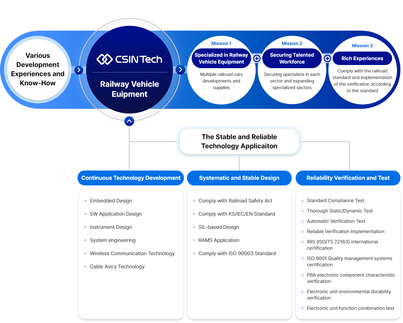 Based on continuous R&D investment and expertise in each field, CSIN Tech has secured global competitiveness in the design and production of railway vehicle equipment. Specifically, we develop and supply On-board Signaling System, Fire Detection System, Train Radio Transmission System, RFID ADS Automatic Switching System, Fire Suppression System.